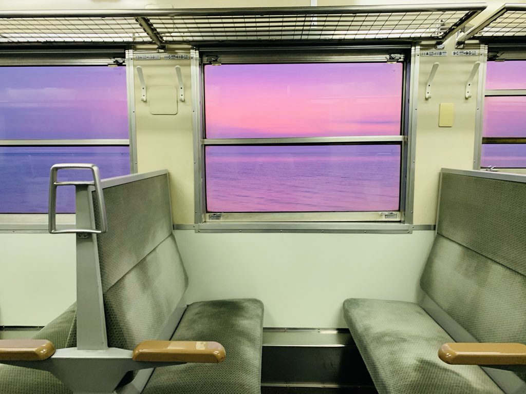 海边修建的铁路会有什么 buff 呢?那当然是海景了。不论是蔚蓝的大海,还是夕日余晖,搭配电车都是非常綺麗的哦。下面引用了一个 Twitter 的 iframe,虽然并不是羽越本线而是秋田 - 青森的五能线,但是羽越本线会有这样的粉紫色落日我觉得也不奇怪哦。